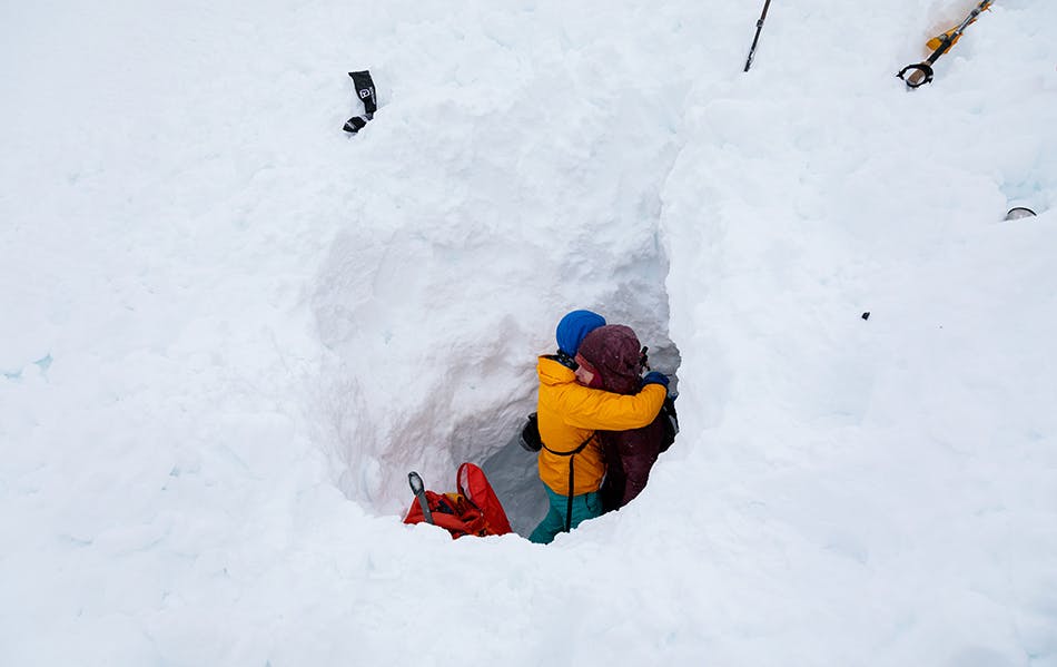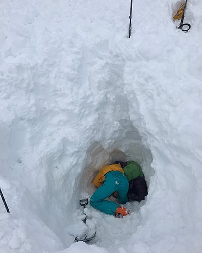 We found the inReach in her pack, activated the SOS and dug her out of that hole for maybe another two hours. When digging, we initially made contact with her close to her head but her lower body and skis were still trapped in the snow. They were down another metre and farther away from us. It took longer than I thought it would to dig her out after we had freed her face and shoulder area because she was still attached to her skis. Our primary objective was to get her an airway and then deal with what came next. We knew that it would take a long time for the two of us to free her.