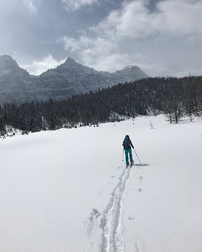 The tour we were going on that day was more a mission to look at climbing options in the area vs a day out getting turns. We skied roughly 12km (7.5 miles) up Moraine Lake road and had a quick snack before starting up the summer hiking trail for Larch Valley.