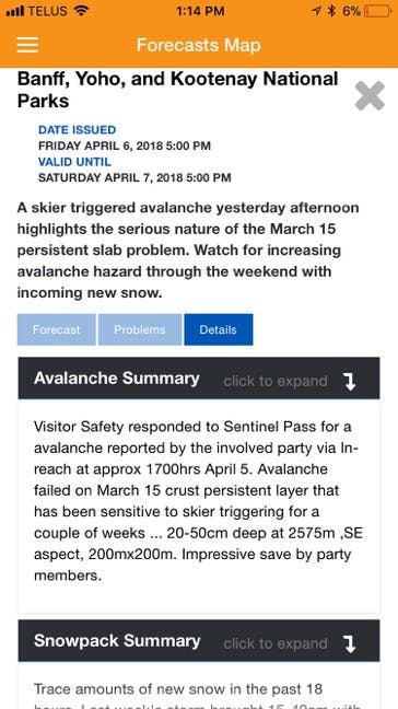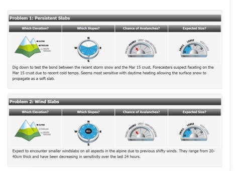 The forecast the following day indicating the details of our avalanche: