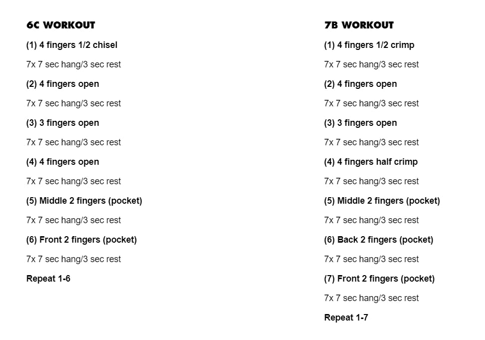 - (1) 4 fingers 1/2 crimp. 7x 7 sec hang/3 sec rest