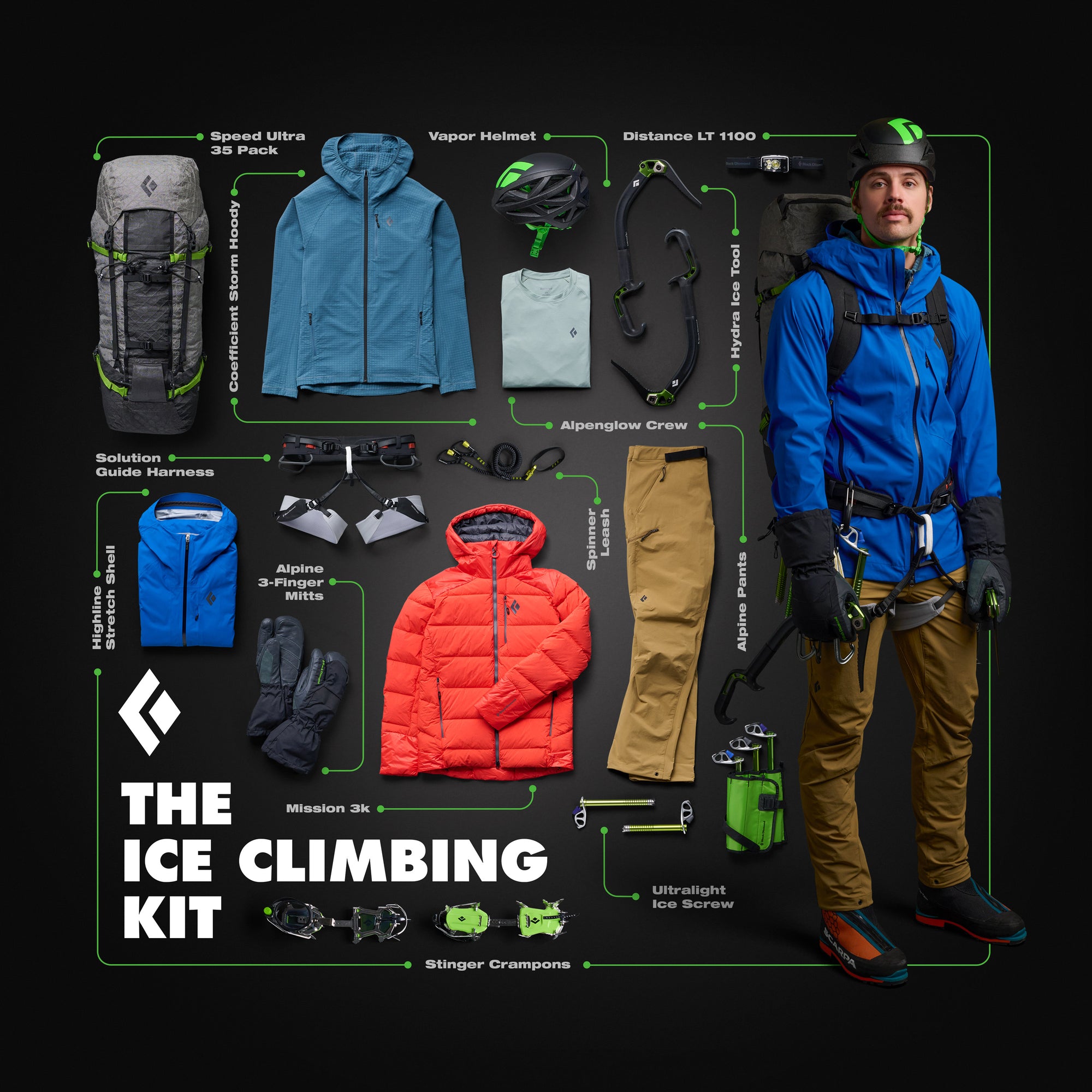 Ice climbing is metal. Sharp tools in your hands. Screws racked on your waist. Get everything you need from our Ice Climbing Kit, featuring the latest in ice climbing innovation, the Hydra Ice Tool, the Mission 3000k Hoody, and the .